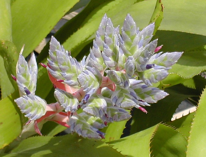 I named this one for the beautiful coral orange color of the stem of the inflorescence and the unique pale blue bracts all of which complement the apple green foliage. Plant is large (for me) - it's in a five inch pot for size gauge. Leaf and inflorescence colors are truer in the close-up.