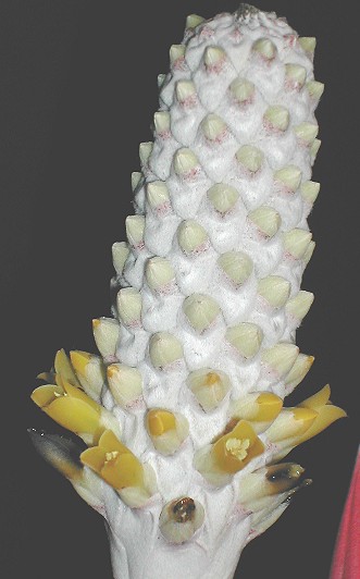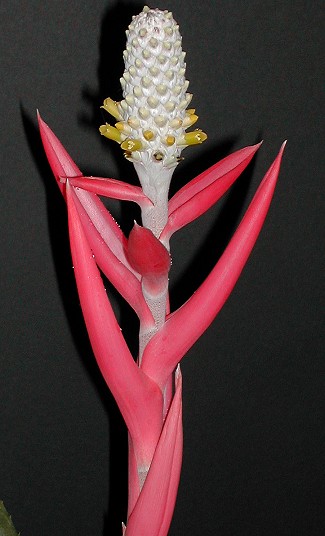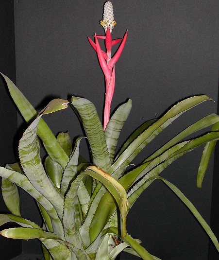 This came to me labelled as Ae.maculata. Because of the red banding on it and my expectation of getting the red form of maculata, I researched the plant. The red banding is not apparent in pics as it appears only after growth in greater light and this plant was photoed after being in a grow-room for the winter, but it appears when grown outside in nearly full sun. As to it's ID, see the page at the FCBS site on this complex, but for the time being go by my pics and description.