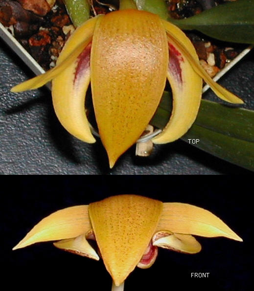 Can't decide on a good angle for this one. Picked it up at Oak Hill mostly dead (only one they had on my Sept pilgrimage two years ago), just a dead pseudobulb and one new smaller one, for $4.It goes to sleep and folds up at night .